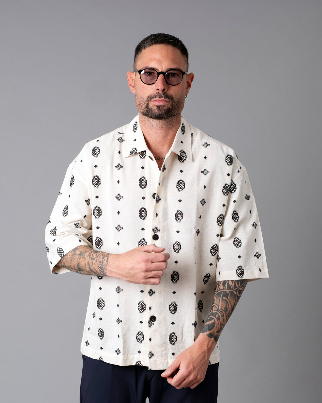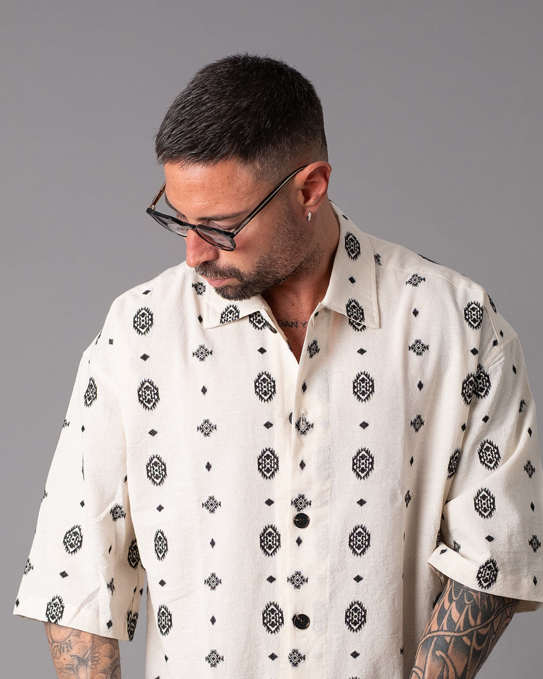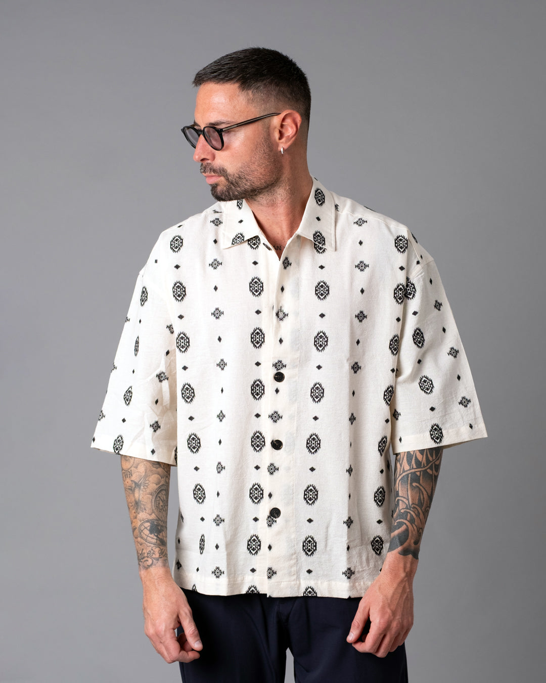 La struttura è leggera e fluida, pensata per essere portata sia aperta su una t-shirt che chiusa per un look più deciso. Le maniche corte e il fit rilassato la rendono perfetta per la stagione calda.