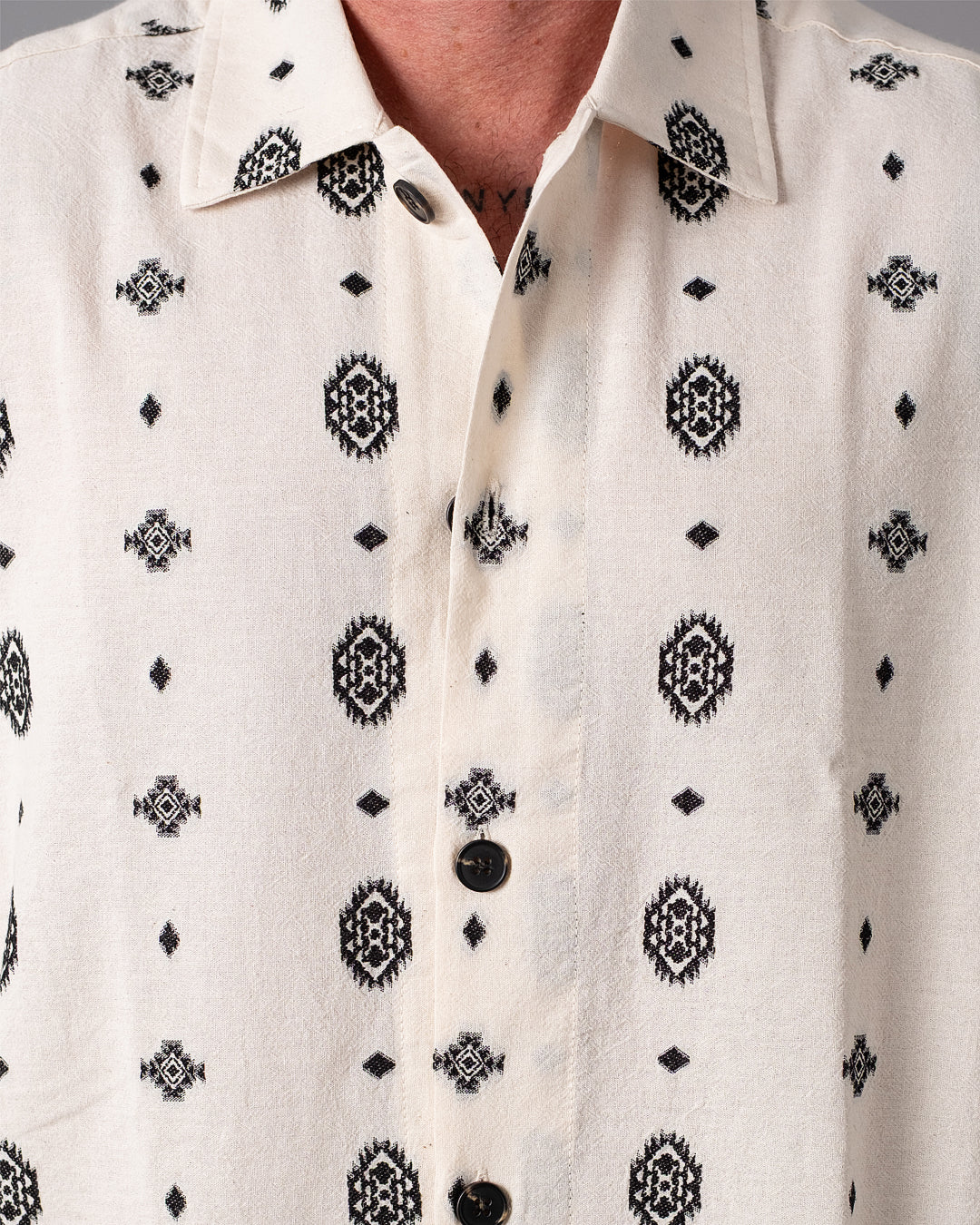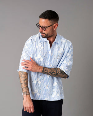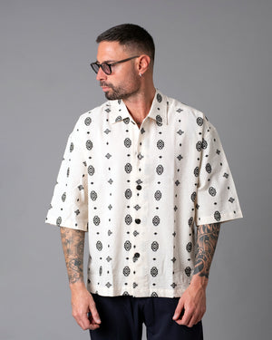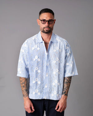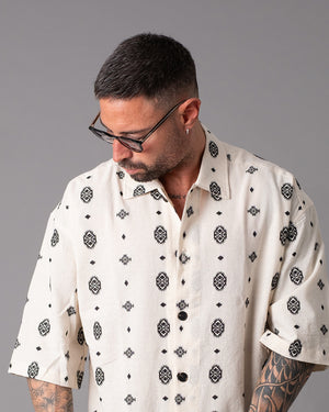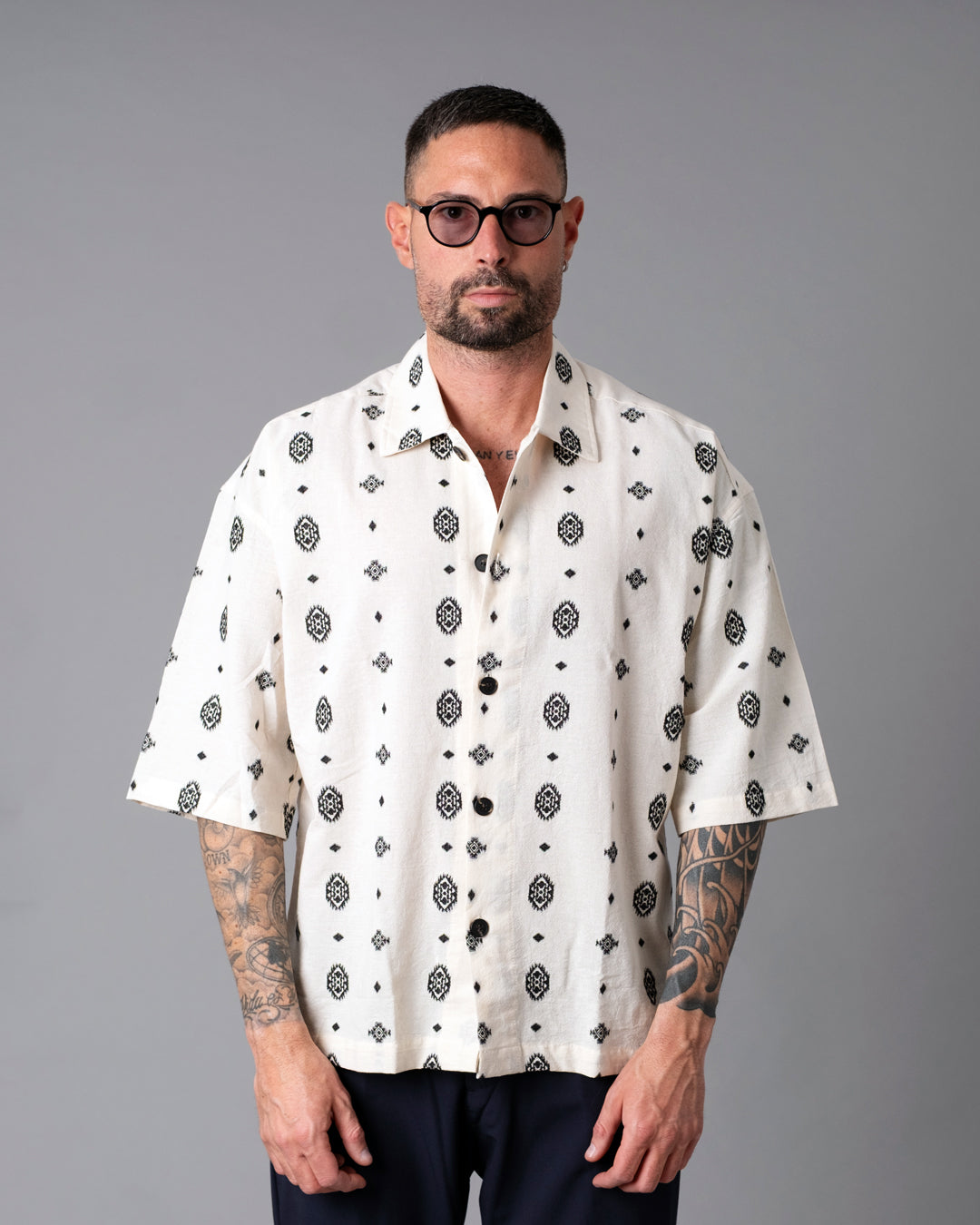 La struttura è leggera e fluida, pensata per essere portata sia aperta su una t-shirt che chiusa per un look più deciso. Le maniche corte e il fit rilassato la rendono perfetta per la stagione calda.