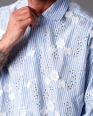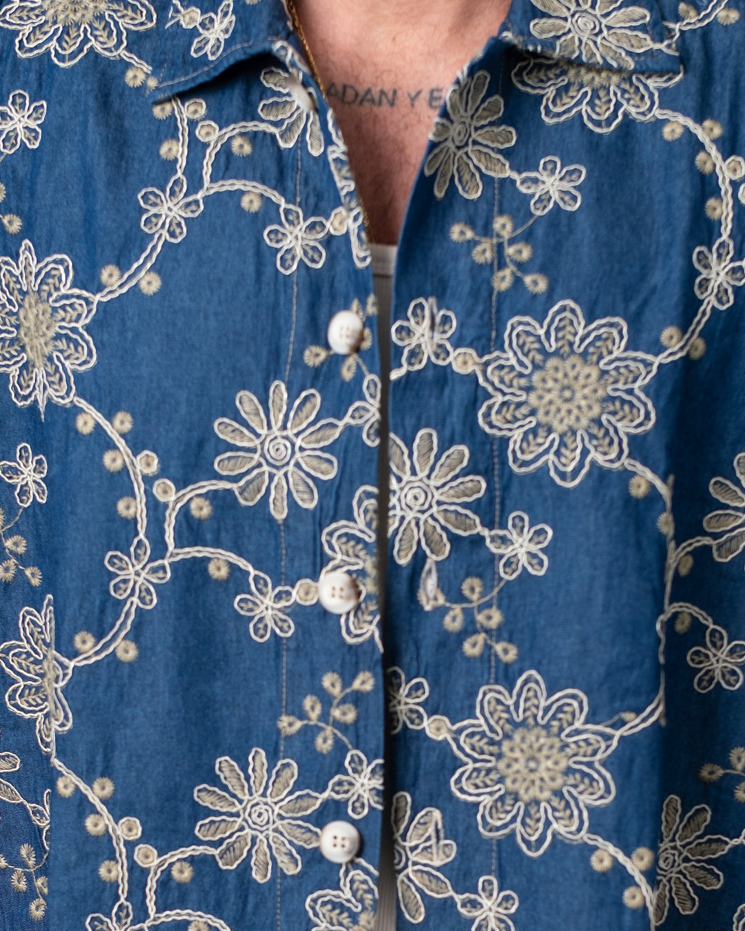 Questa camicia unisce la base denim a una lavorazione ricamata floreale, creando un mix tra carattere e cura del dettaglio. Il risultato è un pezzo distintivo, ma facile da indossare.