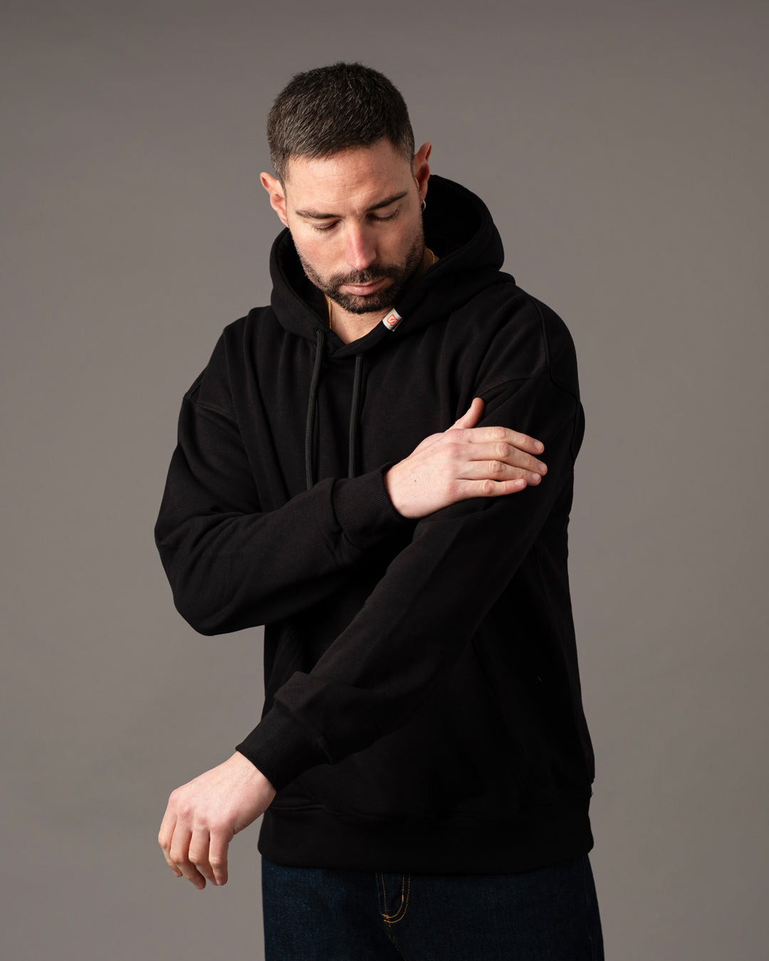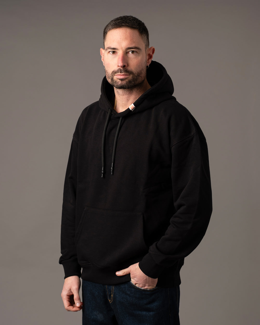 Felpa nera con cappuccio pensata per essere indossata tutto l’anno. Il peso del tessuto è equilibrato, non troppo pesante e non troppo leggero, ideale sia nelle mezze stagioni che nei periodi più freschi o nelle serate estive.La vestibilità è regolare e confortevole, studiata per adattarsi facilmente a diversi stili: perfetta da sola, sopra una t-shirt, oppure sotto una giacca o un cappotto. Un capo versatile, pratico e facile da abbinare, pensato per l’uso quotidiano.Una felpa trasversale, adatta a ogni momento della giornata e a qualsiasi stagione.