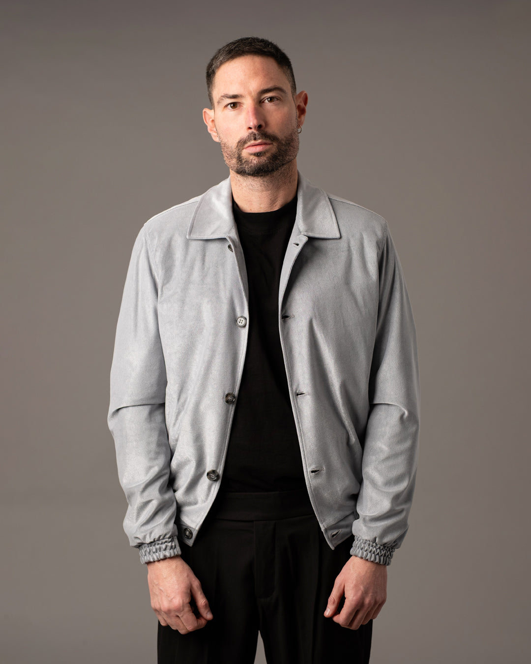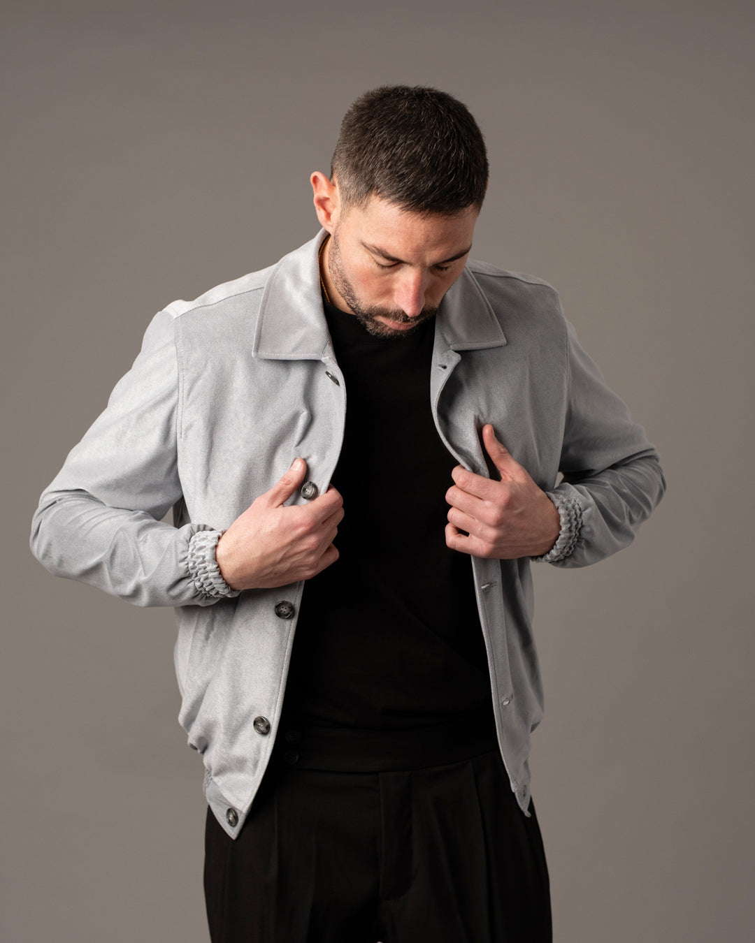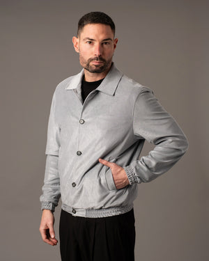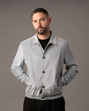Giacca realizzata in tessuto morbido effetto scamosciato, caratterizzata da una texture vellutata e uniforme che dona al capo un aspetto raffinato e contemporaneo.