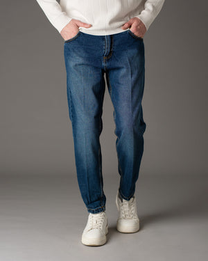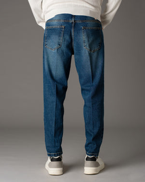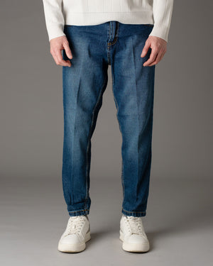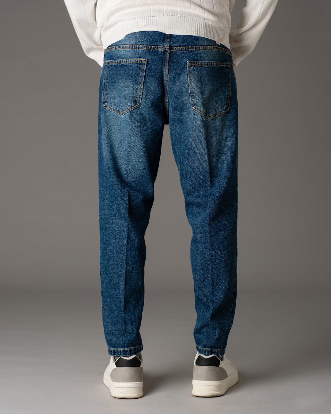 Jeans carrot fit in 100% cotone, caratterizzato da una vestibilità morbida su coscia e bacino che si affusola verso il fondo per una linea moderna e bilanciata.