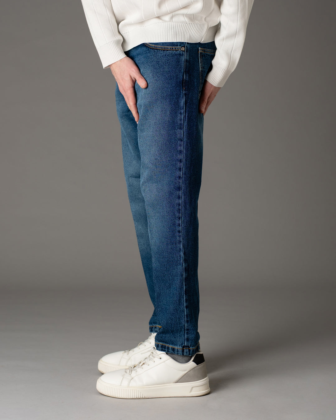 Un denim strutturato ma confortevole, ideale da abbinare a sneaker minimal o mocassini per uno stile casual curato.