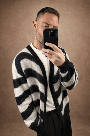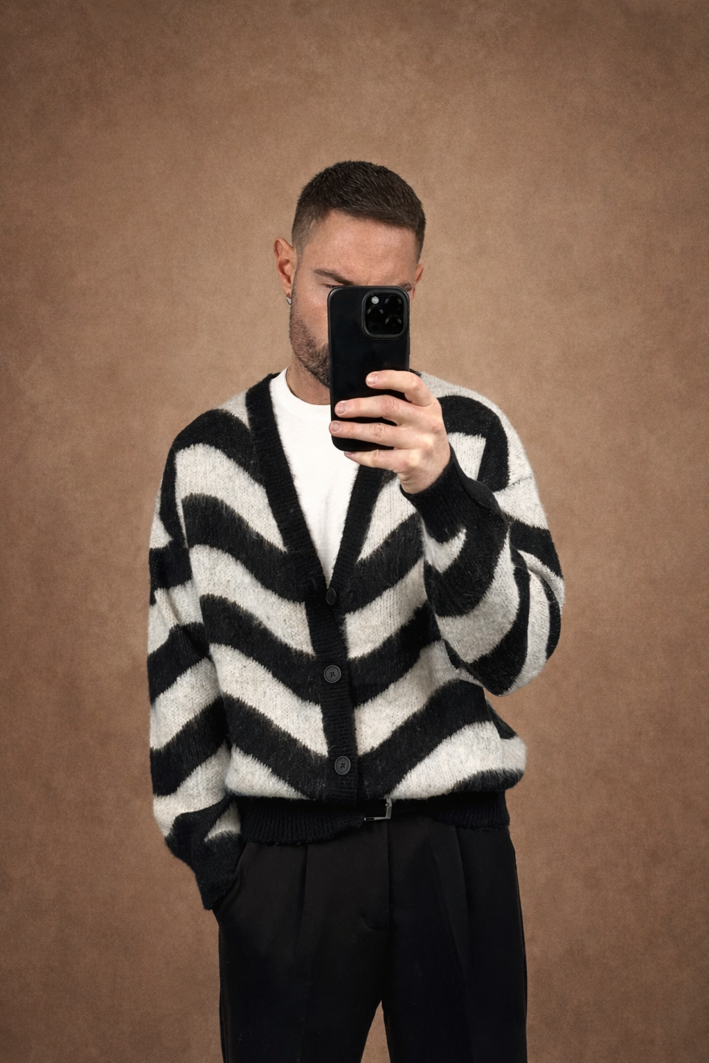 Le righe a contrasto bianco e nero definiscono il capo e l’outfit, rendendolo protagonista anche se abbinato in modo semplice. Il volume è morbido, confortevole, pensato per essere indossato con naturalezza.