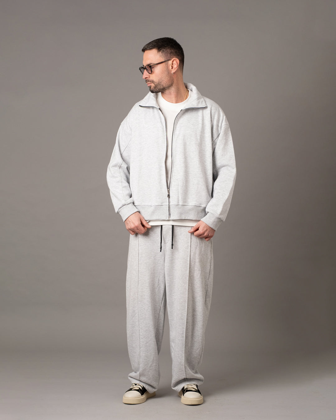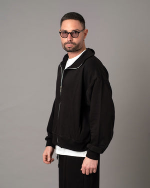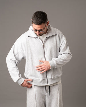 La vestibilità over con spalla scesa crea una silhouette moderna e rilassata. La zip frontale in metallo a contrasto aggiunge un dettaglio tecnico che rende il capo distintivo, perfetto per outfit street ma anche per look minimal più ricercati.