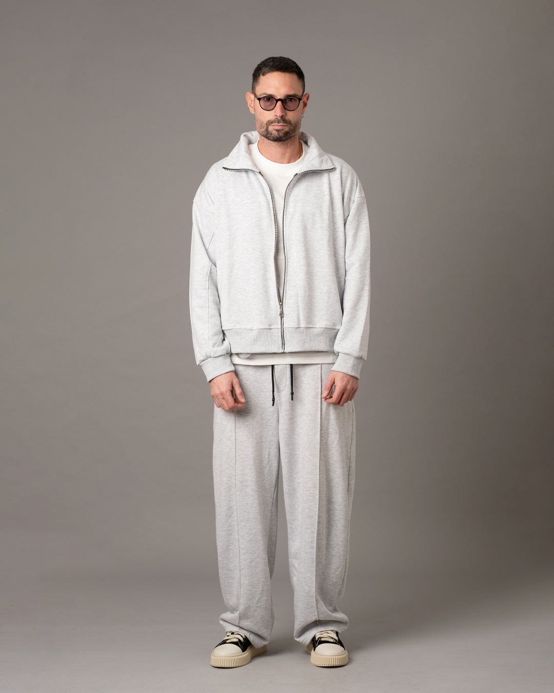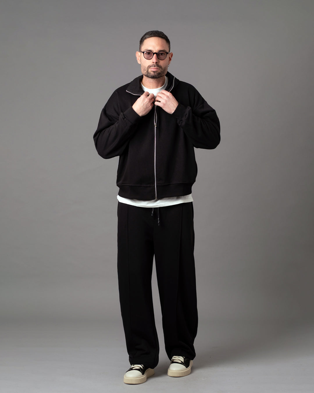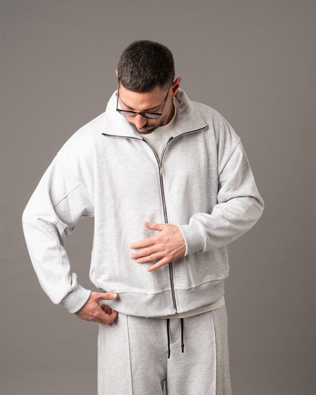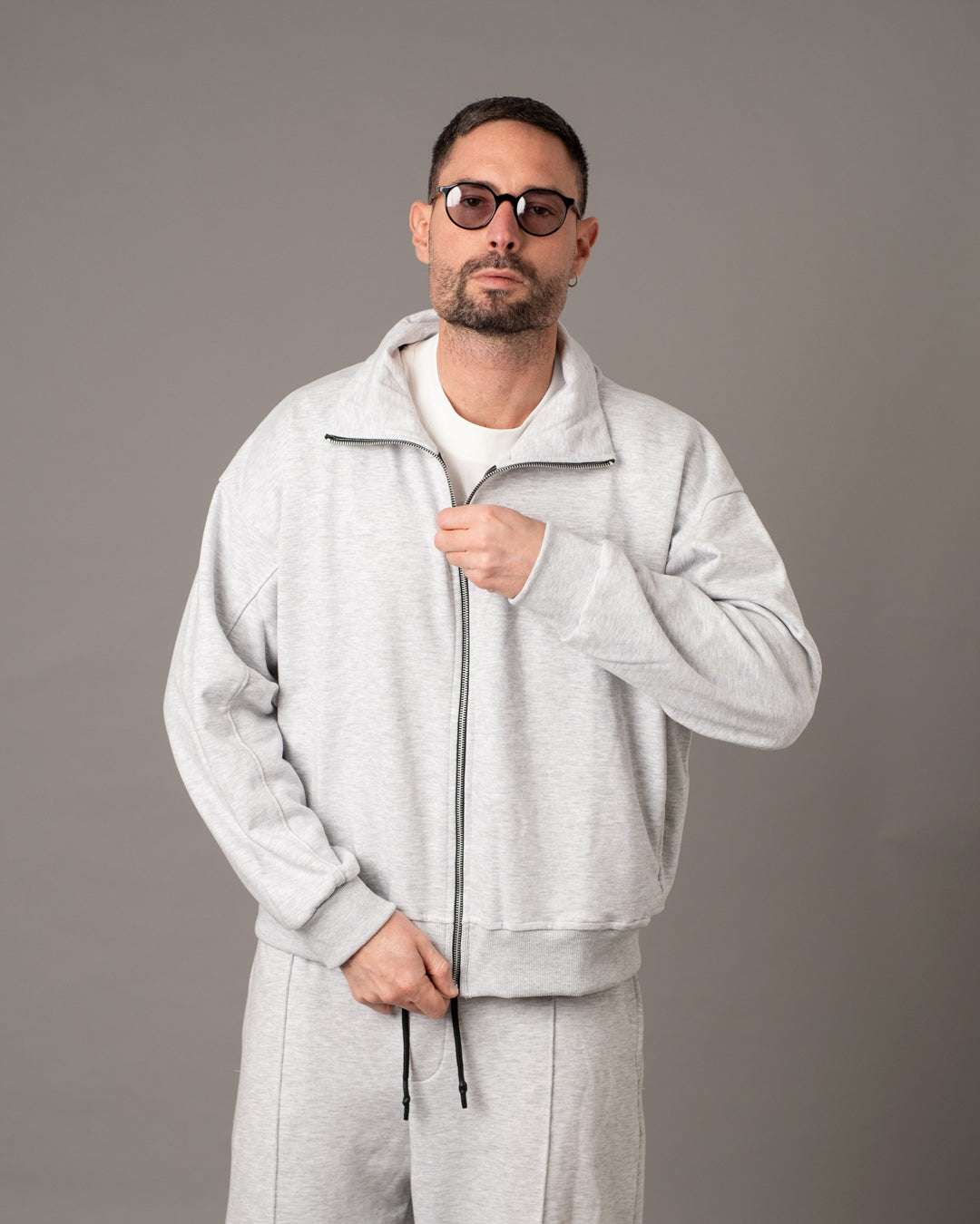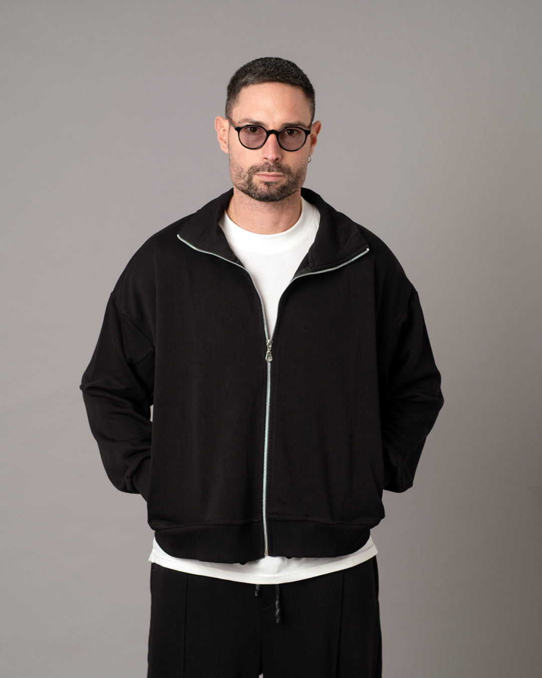 Il collo alto con chiusura zip permette di indossarla aperta per un effetto layered oppure chiusa per un mood più deciso e strutturato.